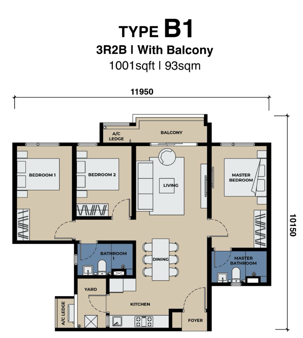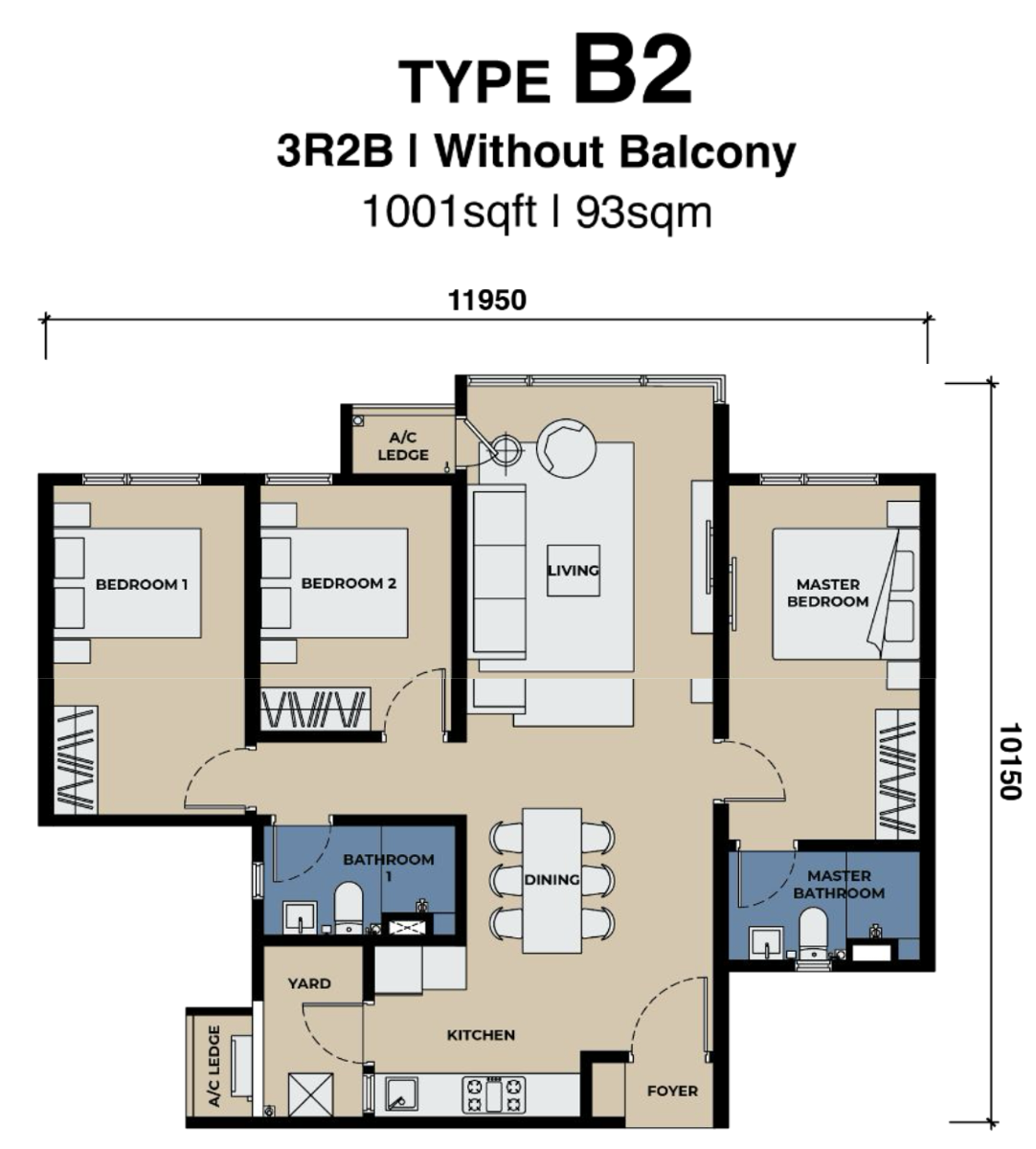 Type B1 features a spacious 3-bedroom, 2-bathroom floor plan designed for families who value comfort, functionality, and style. The layout offers generous living and dining spaces, creating an ideal environment for family gatherings and everyday living.
