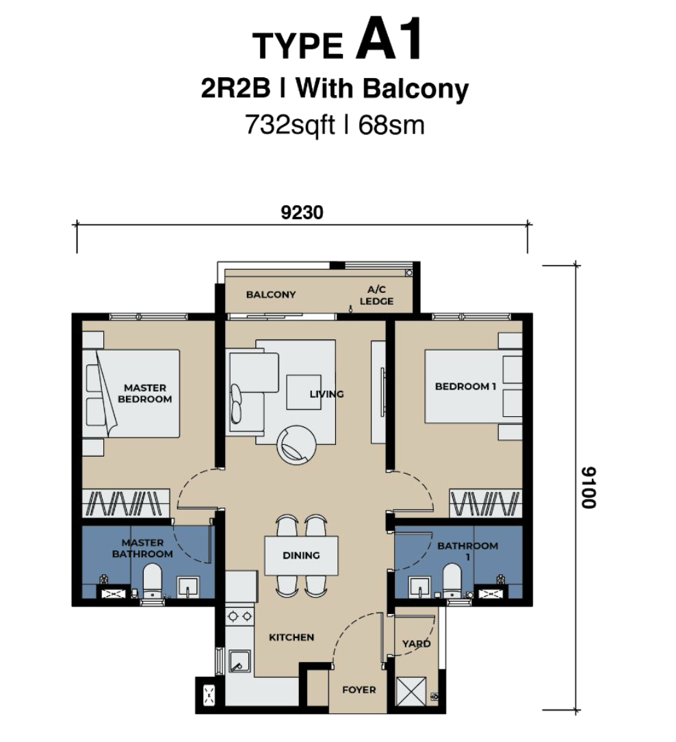 Type A1 is a thoughtfully designed 2-bedroom, 2-bathroom layout ideal for young professionals, couples, and property investors seeking a stylish urban residence in Penang. The efficient floor plan maximizes usable space while maintaining a bright and comfortable living environment.