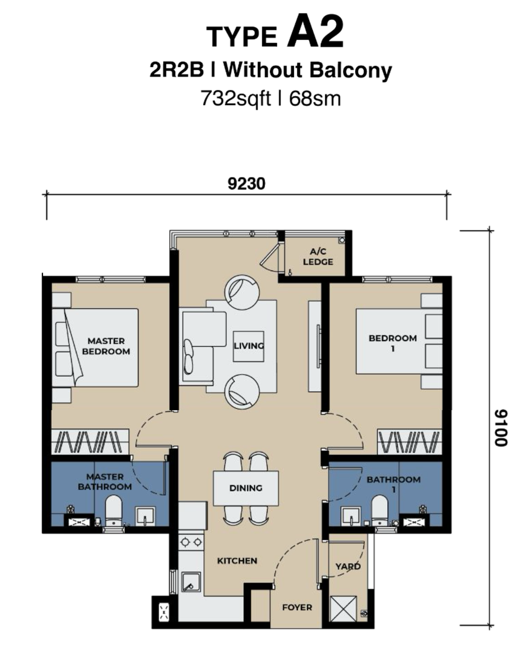 Type A2 offers a flexible and functional 2-bedroom, 2-bathroom layout designed for contemporary city living. This configuration emphasizes efficient space utilization while maintaining a comfortable flow between the living, dining, and kitchen areas.