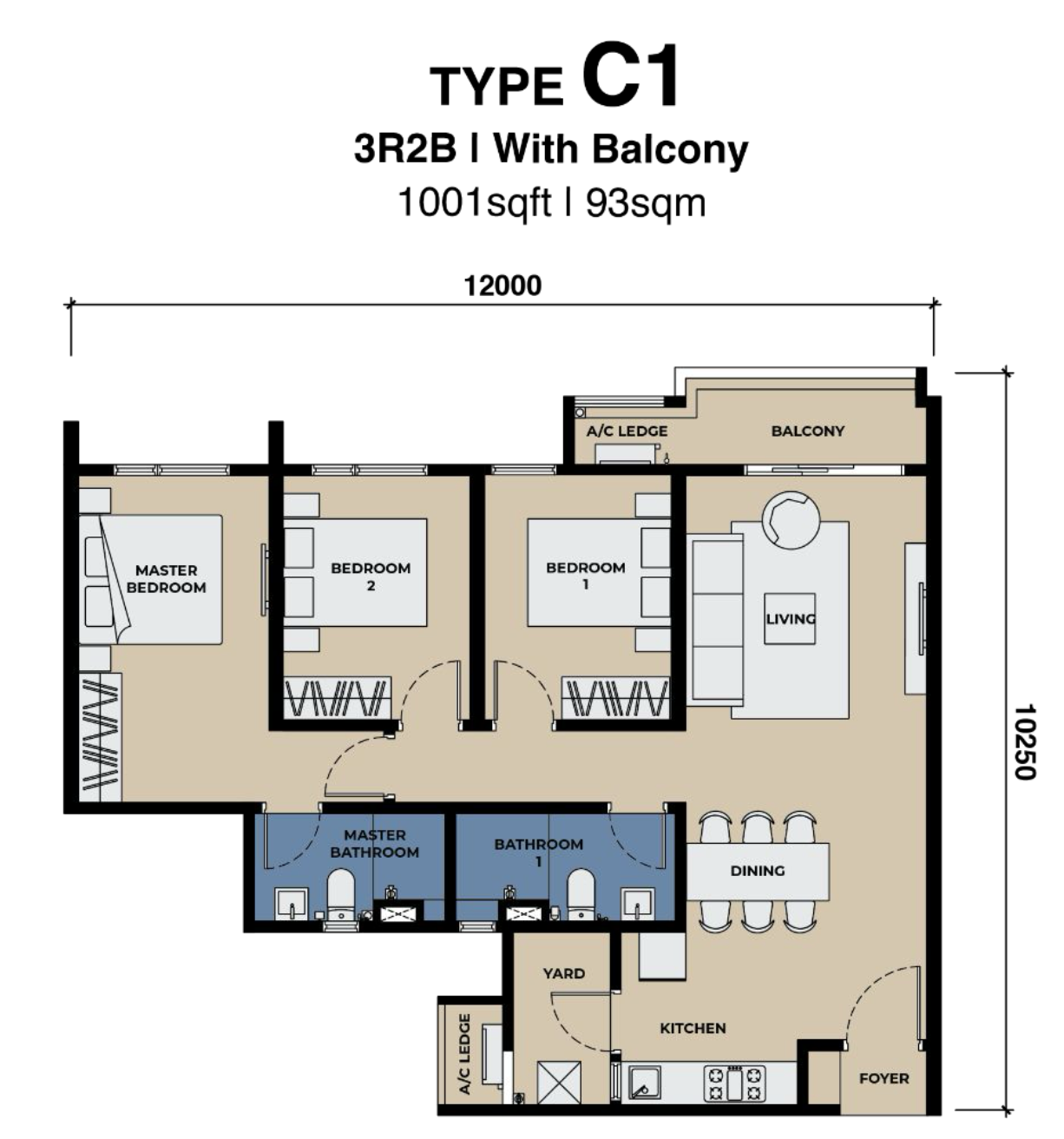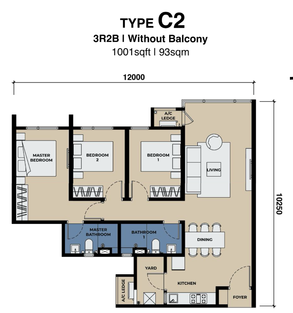 Type C2 presents a sophisticated 3-bedroom layout with enhanced living space and flexibility. The design prioritizes comfort and lifestyle convenience, offering well-proportioned bedrooms and an inviting central living area.